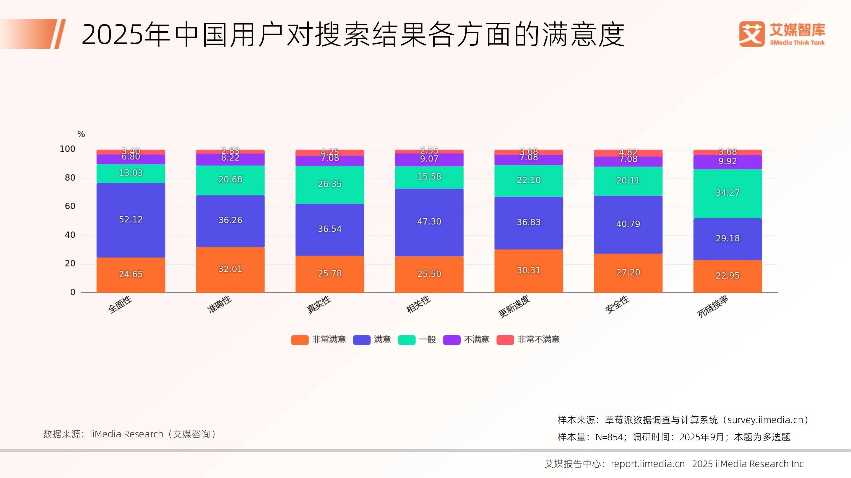 数据显示,在2025年中国用户对搜索结果满意度的调查中,满意度最高的是“全面性”,“非常满意”和“满意”的比例分别为“24.65%”和“52.12%”,满意度合计为76.77%。其次是“相关性”,“非常满意”和“满意”的比例分别为25.50%和47.30%,总计72.80%。“准确性”、“安全性”、“更新速度”和“真实性”的满意度合计分别为68.27%、67.99%、67.14%和62.32%。“死链接率”的满意度最低,合计为52.13%。艾媒咨询分析师认为,搜索引擎平台需在保持结果全面与相关性的优势基础上,重点提升链接有效性,同时持续优化信息真实性与更新速度以巩固用户信任。