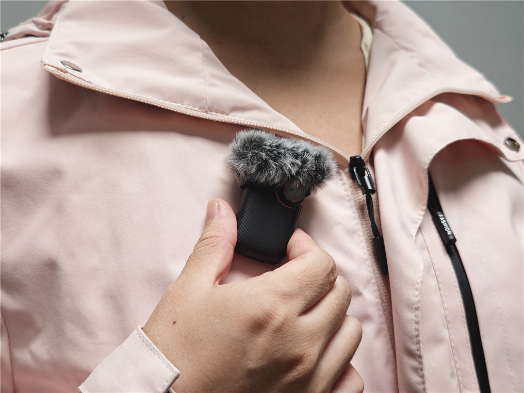 麦克风外观小巧精致,重量很轻,夹在衣领上几乎没有负重感。拿在手里,能明显感觉到它们的质感。麦克风机身小巧圆润,磨砂质感的表面摸起来十分舒服,而且一点都不沾指纹。