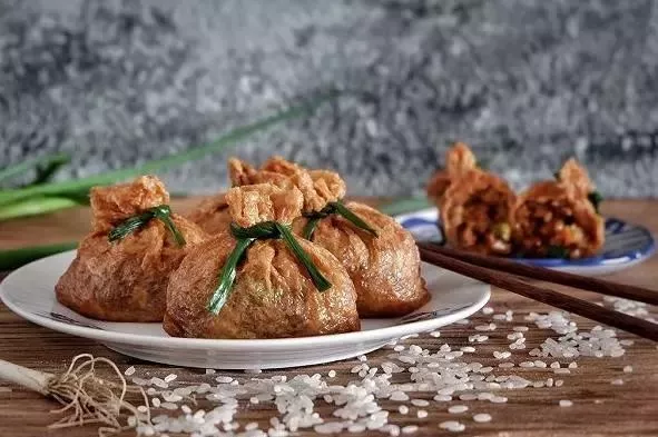 8.取一个日式豆腐包,将其中一个边缘切开,打开豆腐包,填入糯米馅,填到7分满就可以了。用手压实一下,用烫软的小葱叶,把豆腐包绑起来。