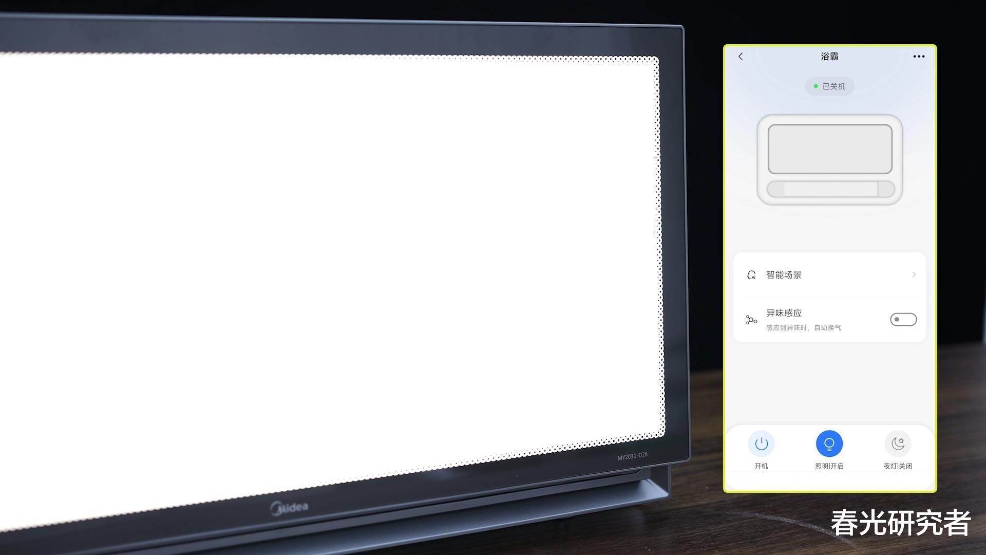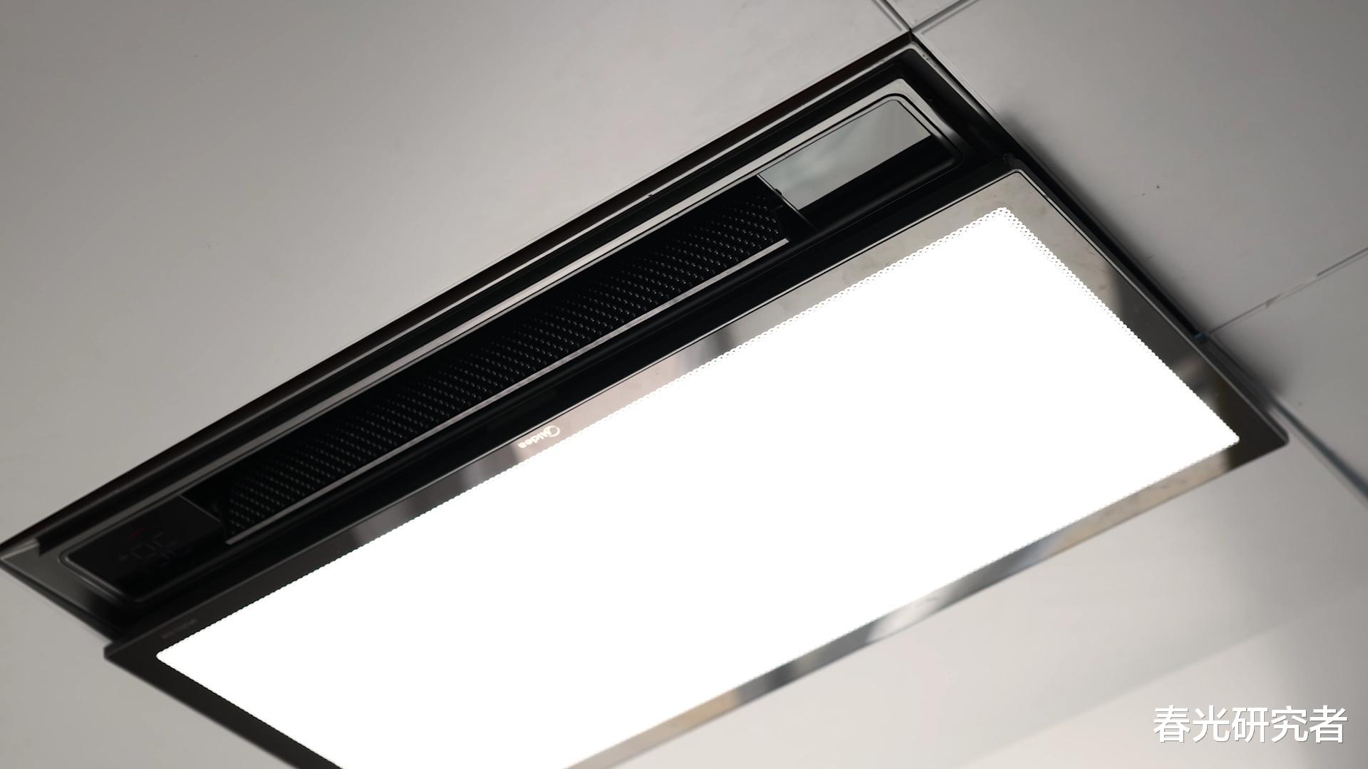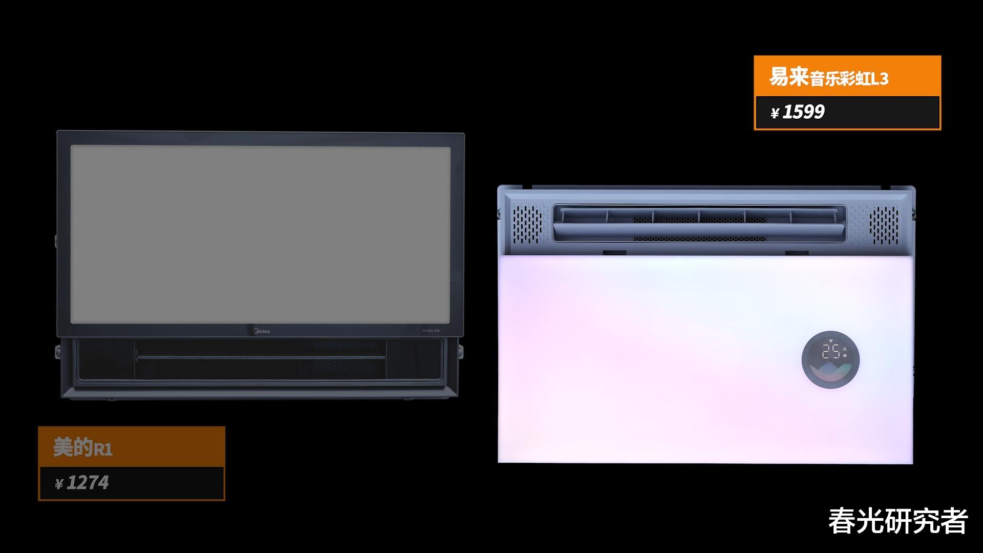 然后美的和易来都是滑盖的设计,出风口隐藏在照明区域下面。区别在于,美的的照明区域有一圈黑边,而且正常状态下是看不到参数屏幕的,只有滑盖打开后才能看到。易来则是更接近全面屏,整个浴霸正面就是一个巨大的照明区域,卫生间面积不大的话,甚至就不需要再额外布灯了,上面还有一个圆形的参数屏幕,科技感更强一些。