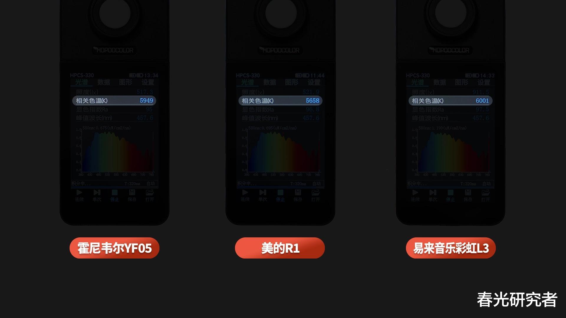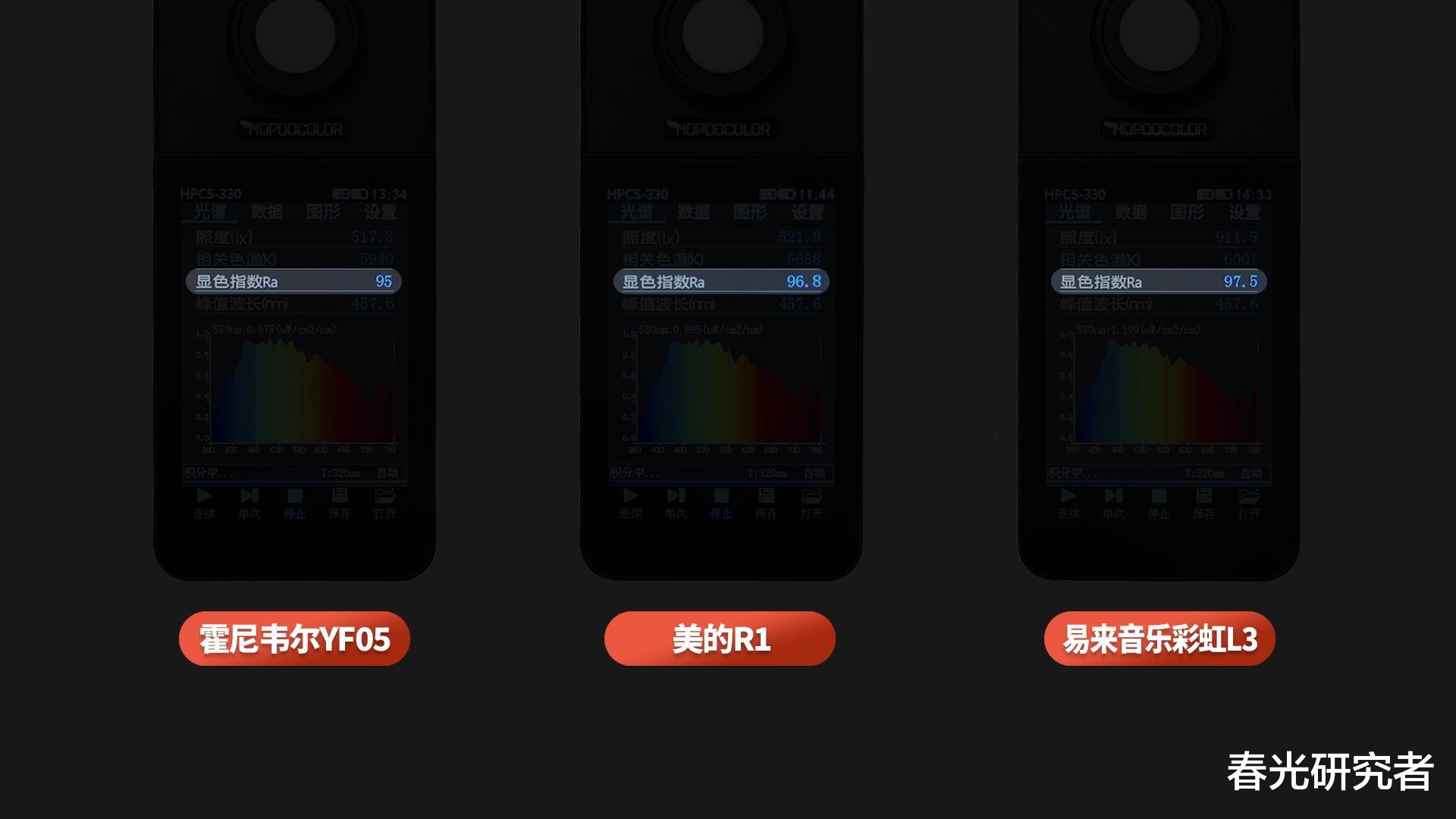 Ra方面,霍尼韦尔的实测Ra是95,美的是96.8,易来是97.5。Ra越高,代表灯光对于物体原本颜色的还原度越好,这里易来的表现要更突出一些。
