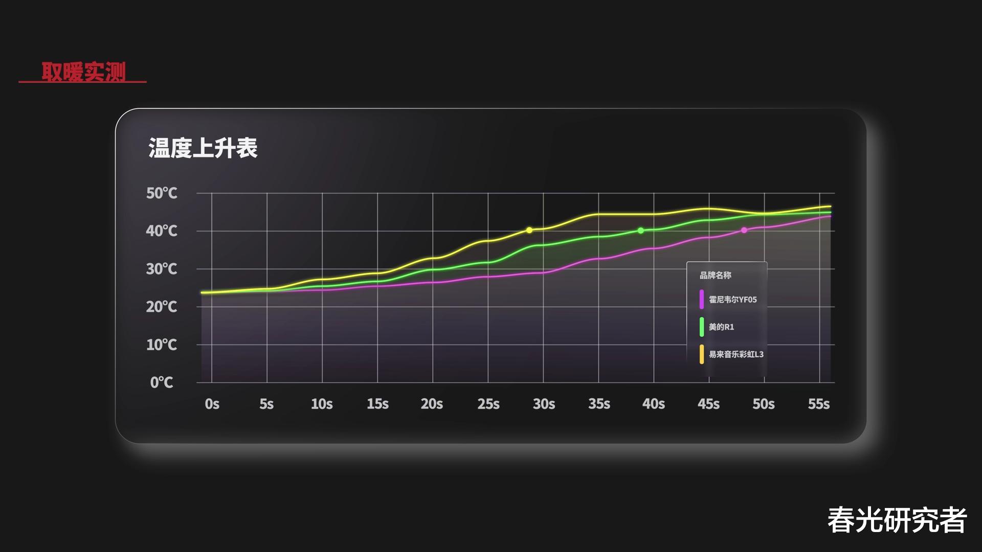 然后我们还在室内设置了多组测温点,打开浴霸之后,记录室内各点的温度变化,取平均值进行对比。在第30秒左右,易来这边率先达到40℃,紧接着是霍尼韦尔,在40秒左右达到40℃,最后是美的,因为它的取暖功率偏低,所以升温稍慢一些也能理解。