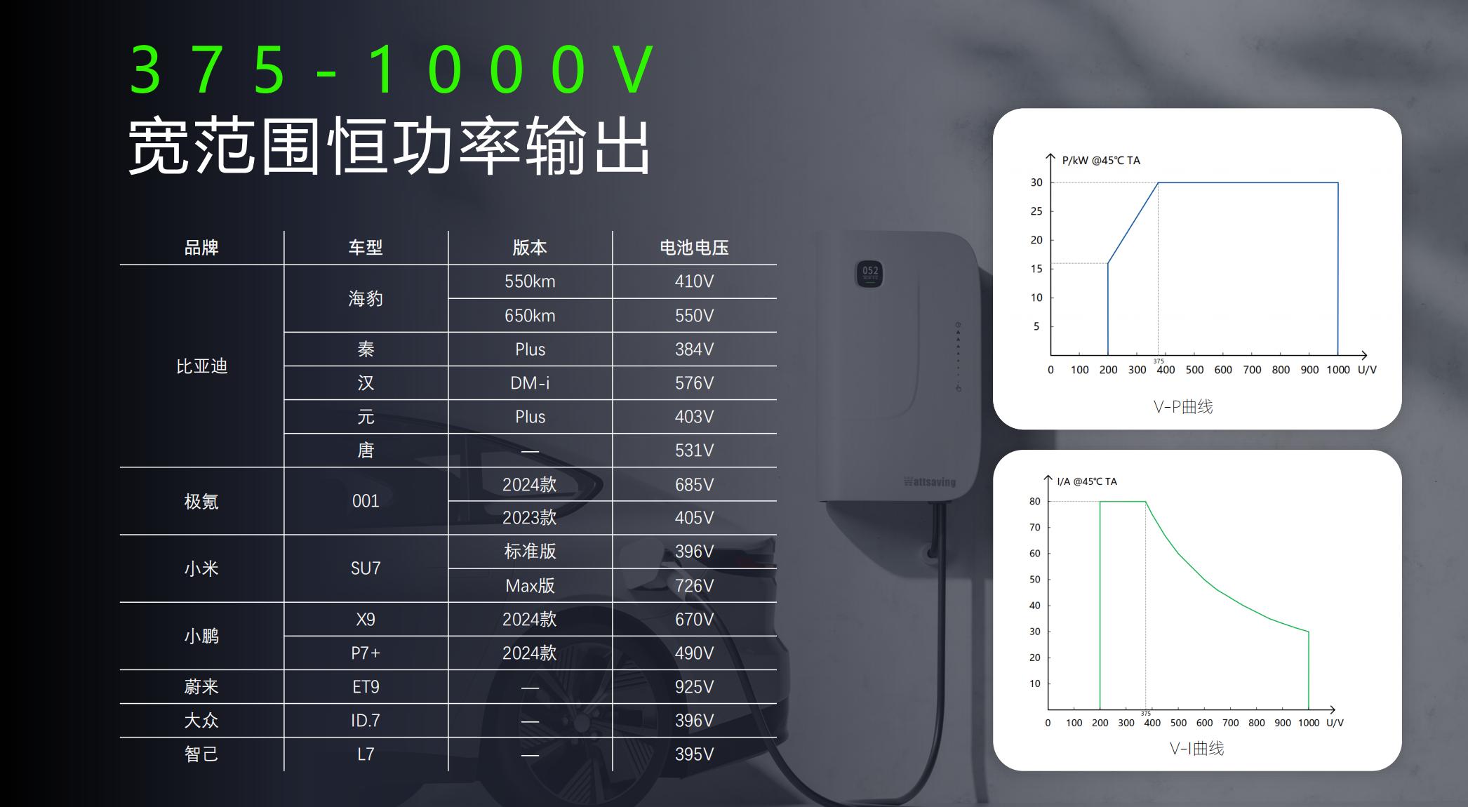 充电效率方面,HQ30 Neo S的表现同样令人印象深刻。它支持375V到1000V的宽电压平台恒功率输出,完美适配当下主流新能源汽车品牌和车型,包括理想L6、小米SU7、极氪001、小鹏X9、比亚迪汉、蔚来ET9等,不论电压高低都能以接近满功率运行。对于常见的20%至90%电量区间补能,HQ30 Neo S只需两小时左右即可完成充电。而且得益于HQ30 Neo S的充电模块工作效率高达 95%,这意味着在充电过程中,能量的损耗极低,能够最大化地利用电表的容量,避免浪费。