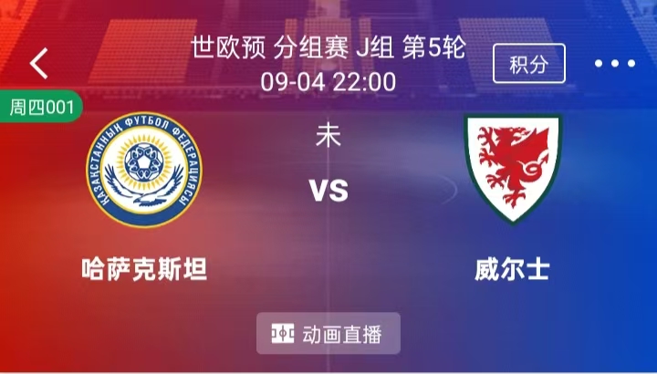 九月四日世界杯欧洲区预选赛将进行哈萨克斯坦与威尔士的交锋,比赛于阿斯塔纳竞技场举行。哈萨克斯坦目前位列H组第四位,积18分,进球数为16粒,失球12次;威尔士位列D组第三位,积12分,进球10粒,失球10次,双方在整体实力上存在明显差距。
