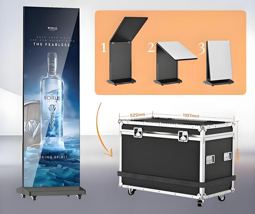 在设计上,LED折叠广告机更加轻薄,颠覆了人们对传统LED显示屏厚重的印象。对折后,能轻松收纳,不占用过多空间。此外,还贴心配置了360°万向轮,无论是移动位置,还是进行跨区域的运输,都能轻松实现,极大降低了人力、物力成本。