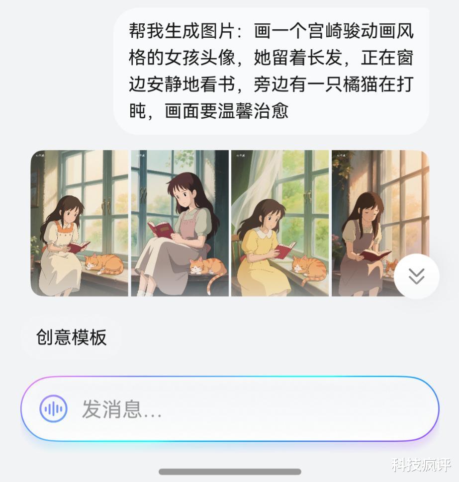 搞定了职场头像,我又想给微信和小红书也换个新面貌。这两个平台风格自然要更个性、更生活化一些。给微信换头像时,我想要一个轻松治愈点的,于是我的指令是:“画一个宫崎骏动画风格的女孩头像,她留着长发,正在窗边安静地看书,旁边有一只橘猫在打盹,画面要温馨治愈。”生成的图片,那氛围感瞬间就出来了,温暖又恬静,正合我意。
