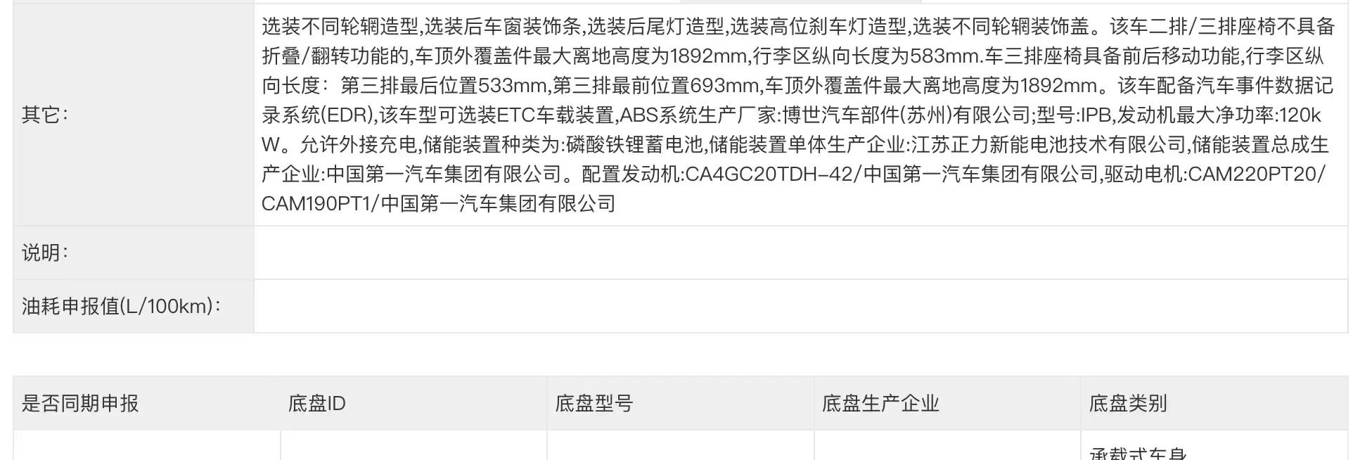 在动力配置方面也有新看点。申报文件显示,2.0T发动机型号有所更新,变化不大,但最大的不同在于驱动方式——单电机两驱终于上线。此前HQ9 PHEV全系标配四驱,突出豪华与商务属性,如今两驱版本的出现,无疑降低了入门门槛。电池采用江苏正力的磷酸铁锂产品,这类电池成本更低,安全性与寿命有保障,虽然体积较大,续航表现成为关注重点。