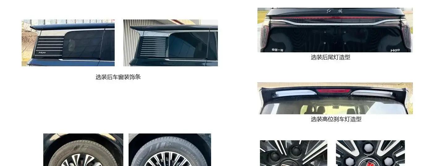外观方面,依旧延续了中式高端设计风格。高山飞瀑的进气格栅、飞翼灯、发动机盖上的旗贯山河旗标,气场依然强烈。车身侧面采用灵感来自故宫的装饰条,与侧标把手一体化设计,尾灯则取用了书法中的“横折卧钩”,品牌辨识度极高。申报选装件种类也不少,包括多种轮毂、外观饰条、尾灯样式,甚至后窗饰条都能选择,显然是为了满足不同消费群体的个性化需求。