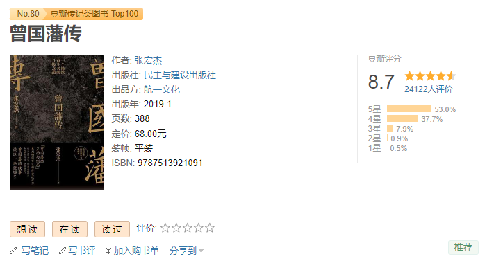 作为常年位列豆瓣历史类高分榜单的经典著作,《曾国藩传》由知名历史学者张宏杰执笔,不仅是无数职场人、创业者的成长指南,还曾被多位商业大佬评价为 “参透成事逻辑的必读书籍”。