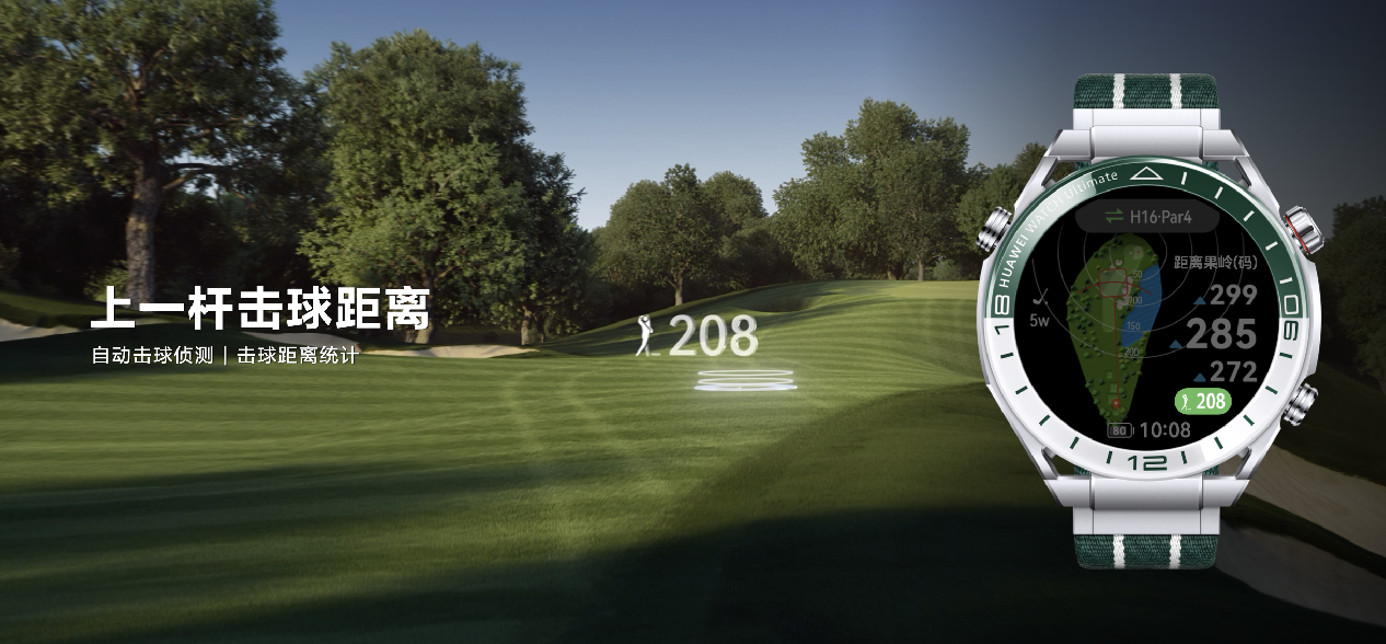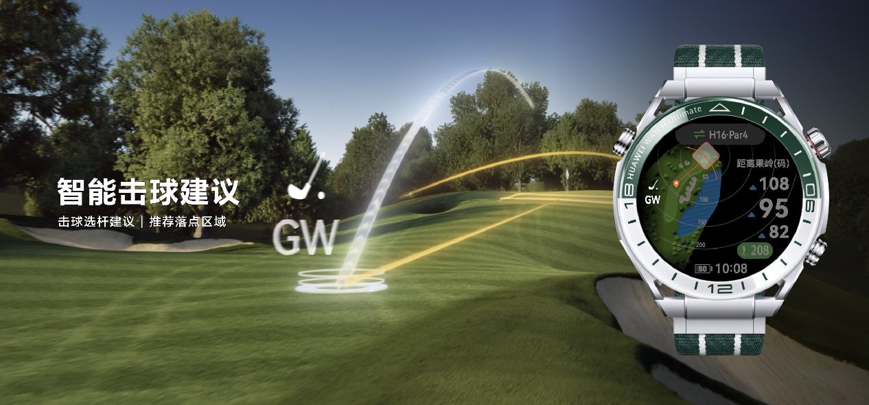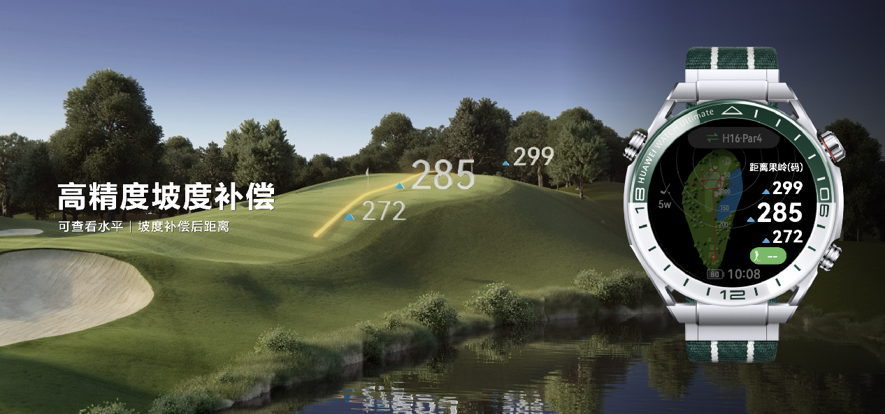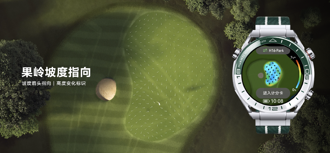 华为WATCH Ultimate非凡探索“绿野传奇”首发全球高尔夫球场模式,覆盖全球超过1.5万家高尔夫球场,新增球场3D立体视图效果、坡度补偿距离、击球距离、智能击球建议、果岭坡度指向、半场计分报告等功能,为球场精英们带来高阶智能运动体验。