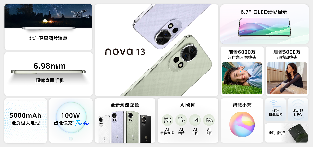 华为nova13系列手机全新的华为nova 13系列,带来6.98mm的轻薄机身和6.7英寸的利落直屏设计,同时支持湿手触控、100W智能快充Turbo。另外全系列搭载北斗卫星图片消息、AI修图、5000mAh大电池等,打造nova史上最强直屏手机体验。