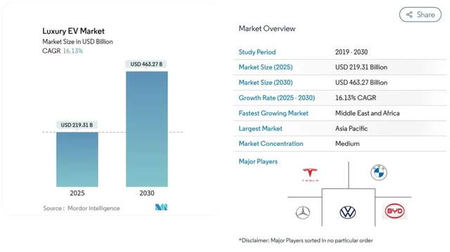 根据Mordor Intelligence的预测,2025年全球豪华电动车市场规模预计将达到 2193亿美元,到2030年则有望突破4630亿美元,五年复合增长率超过16%。豪华新能源赛道正在快速扩容。