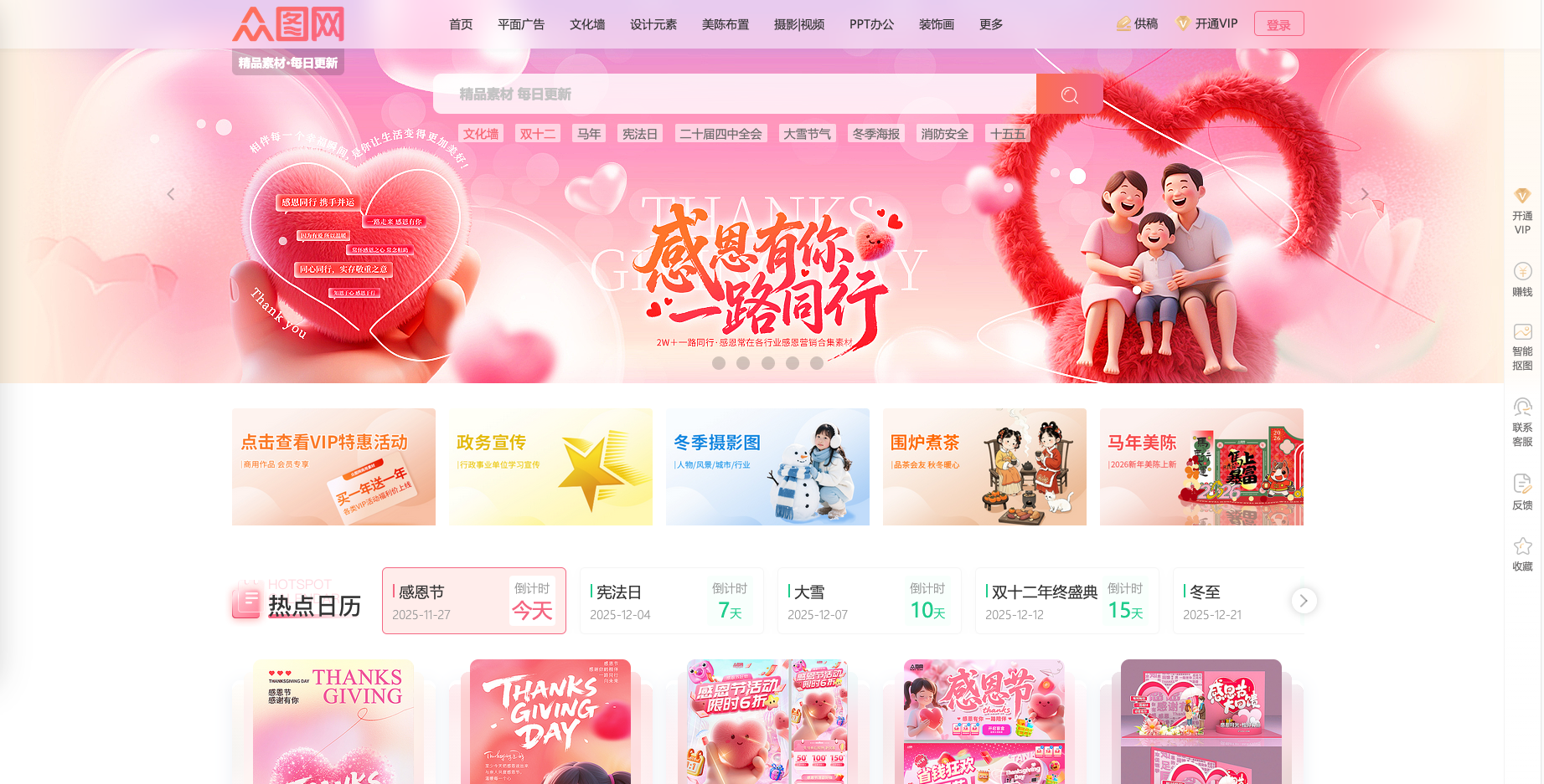 众图网是国内热门的正版创意素材平台,以 “年轻化、高适配、性价比” 著称,特别受中小设计团队和自由设计师青睐。平台累计收录超 400 万张优质图片素材,其中 PSD 分层素材、设计元素、创意模板占比突出,尤其在节日营销、电商设计、新媒体海报等场景的 PS 素材上优势明显,分辨率从高清到 4K 全覆盖,完全满足 Photoshop 编辑的清晰度和细节需求。网站分类逻辑清晰,专门设置 “PS 素材” 专区,细分 “海报模板”“背景素材”“字体元素”“节日专题” 等子栏目,支持按风格、尺寸、用途精准筛选,还提供素材预览功能,可提前查看分层结构和编辑效果,避免下载后无法使用的麻烦。
