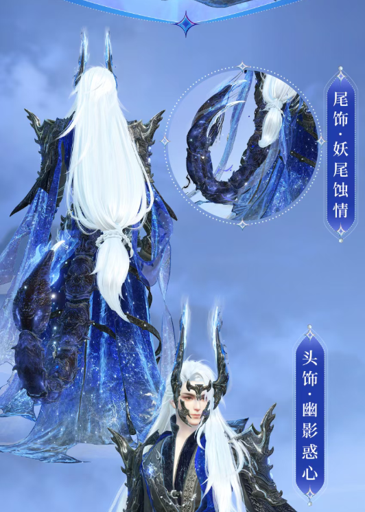 在配饰方面这套时装也相当用心,其尾饰【妖尾蚀情】采用了经典的蝎尾设计,造型霸气的同时还闪烁着幽幽蓝光,与深蓝色的长袍完美适配。而头饰【幽影惑心】则是以蝎子精头上的两个螯钳为灵感,将其作为头饰以凸显其霸气绝伦的形象。