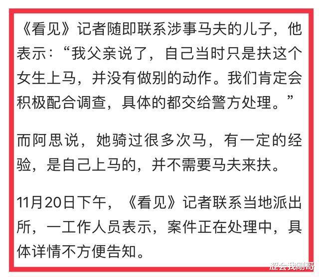 涉事马夫的儿子在接受采访时回应称,其父亲当时只是扶女生上马,并没有做别的动作。他表示:“我父亲说了,自己当时只是扶这个女生上马,并没有做别的动作。我们肯定会积极配合调查,具体的都交给警方处理。”涉事马夫的儿子表示,他们会积极配合警方的调查,提供必要的信息和证据,以还原事情的真相。