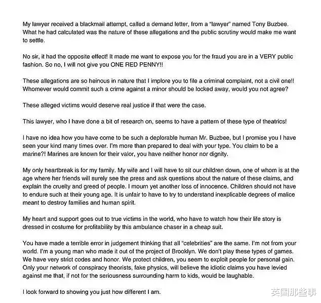 “我唯一感到心碎的是我的家人,我和我的妻子必须让我们的孩子们坐下来,其中一个孩子已经到了她的朋友肯定会看到媒体、并询问这些指控的性质、并解释人们的残忍和贪婪的年龄。”