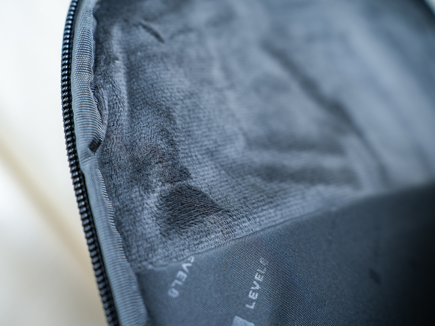 ▲分区设计部分,首先是靠近背板的独立电脑收纳仓,最大支持15.6英寸的笔记本,收纳仓内置加厚缓冲层,日常通勤/出差使用可以很好的避免挤压/磕碰现象;收纳仓与笔记本接触部分也有绒布内衬,日常可以很好的保护笔记本表面,特别是现在主流的金属材质,一点划痕还是很明显的。