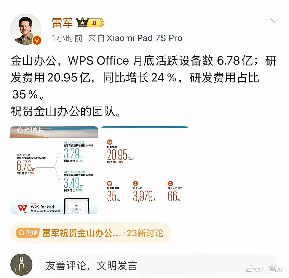 他晒出了金山办公的成绩单:WPS Office月活跃设备数达到6.78亿,研发费用20.95亿,同比增长24%,研发费用占比高达35%。雷军祝贺了金山团队,字里行间透着骄傲。