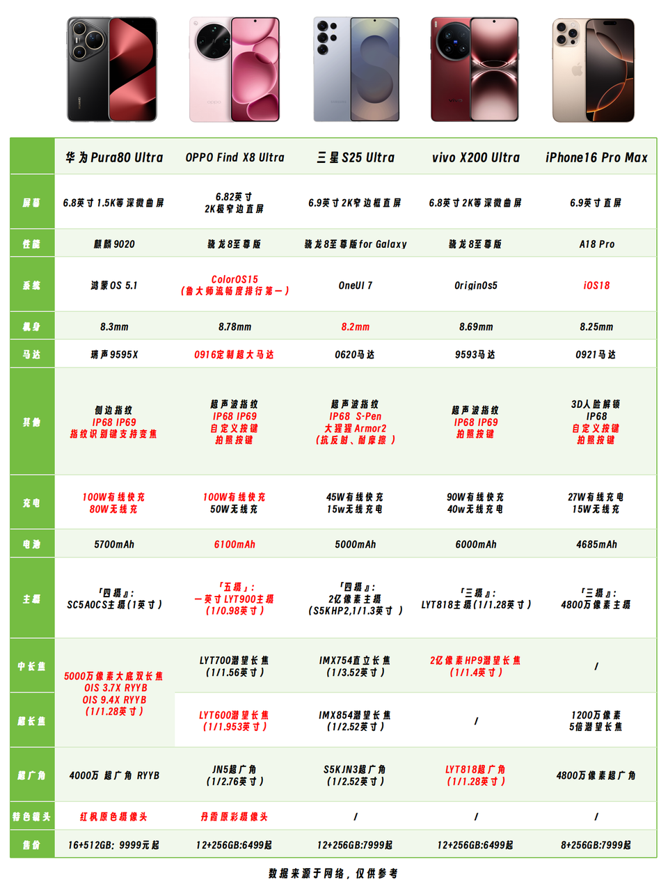 结合价格看,相对来说笔者会更推荐OPPO Find X8 Ultra,影像均衡+性能顶级+综合配置强,5499起的价格很香。如果是不缺预算的选手,那可以选择刚开售的华为Pura80 Ultra或者iPhone 16 Pro Max,追求极致影像可选择可外挂镜头的X200 Ultra。这五大旗舰,哪一款会是你的菜?