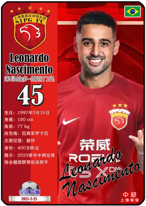 NO.3 莱昂纳多-纳西门托:21球(0点球)