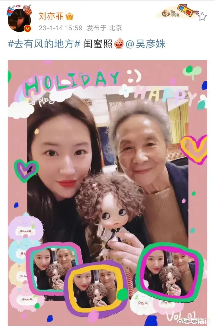 1月14日,著名女演员刘亦菲在个人社交平台晒出一张照片,并配文:闺蜜照。消息发布十分钟后,引发网友关注和热议,点赞数达到5万。让人意想不到的是,文中提到的刘亦菲闺蜜不是舒畅,也不是张靓颖,更不是杨幂和唐嫣,而是84岁的吴彦姝老师。画面中,刘亦菲和吴彦姝素颜出镜,一头柔顺长发,仙气十足,清新干练,一头白发,眼神慈爱优雅,简直太养眼了!两人中间夹着一个布娃娃,刘亦菲还给照片加上特效“holiday”,瞬间营造出过年的气氛!直说吧:许红豆和阿奶的感情超越荧幕!网友也纷纷表示:去有风的地方好美,好喜欢这个豆奶CP!红豆和阿奶太可爱了[心]两位优秀的女演员表示,豆奶CP既然是奥黛丽赫的粉丝,那么同粉自然会成为好闺蜜!网友这么说,是真的,刘亦菲曾发朋友圈里的奥黛丽赫本就是她的偶像,说自己是她的忠实粉丝,奥黛丽赫本是她的偶像,而吴彦姝也公开表示:非常崇拜奥黛丽赫本,她一直想成为奥黛丽赫本那样的明星。刘亦菲35岁,吴彦姝84岁,两人虽然相差将近50岁,但却有着共同的偶像。闺蜜之所以是闺蜜,是因为她们经常有许多相同的爱好,所以好闺蜜没有所谓的年龄限制。在此祝愿刘亦菲(许红豆)和吴彦姝老师(阿奶)两位闺蜜友谊久久,新年快乐!