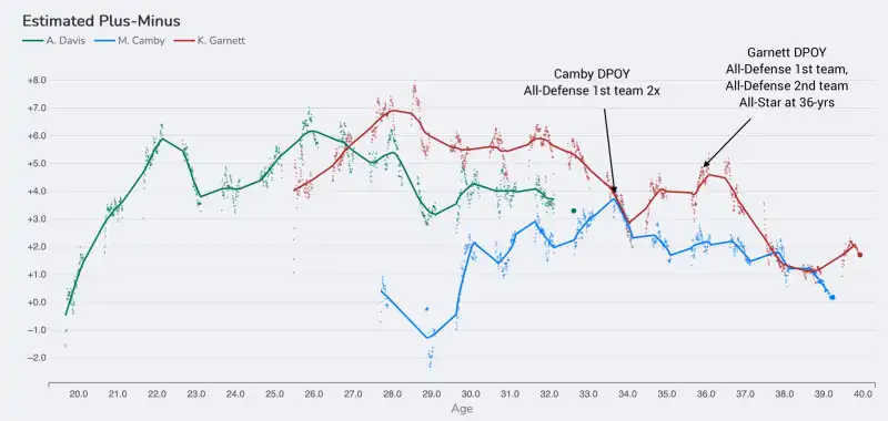 因而我觉得马库斯·坎比是一个有趣的参照点,他是少数在32岁前缺阵比赛百分比高于戴维斯的球员之一。坎比和戴维斯一样,背负着“玻璃”大个子的标签,其职业生涯也遵循着类似的模式:各个赛季都分布着大量缺阵场次,但没有一次是真正灾难性的大伤。但坎比在三十岁出头时摆脱了一部分此种“恶名”。从2005年到2008年,即31岁到33岁间,他连续三年领跑联盟盖帽榜,借此两度入选一防,外加一次二阵,并在2007年达到顶峰,荣获年度最佳防守球员——时年刚满33岁,正与戴维斯来年春天的年纪相同。更重要的是,从32岁到35岁的四个赛季里,他分别出战了70、79、62和74场比赛,场均上场时间均超31分钟。