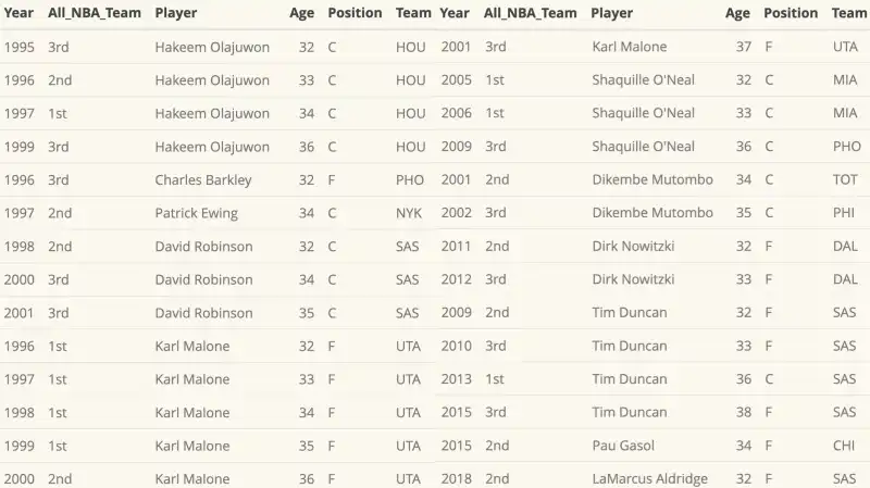因而自1994年以来,实际上仅11名大个子球员在32岁或以上年龄入选过最佳阵容。若细究,这些入选大多发生在1990年代和2000年代,那是当今更快节奏、注重空间的时代之前,由身体对抗型大个子主导的时期。