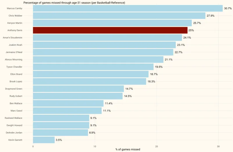 戴维斯职业生涯的缺阵情况确实位居这些大个子中的前列,数据上接近于阿玛雷·斯塔德迈尔、肯扬·马丁和克里斯·韦伯等球员。这些球员的巅峰期,某些情况下甚至是整个职业生涯,都因源源不断的伤病侵袭而被迫缩短。但在与斯托茨交流并深入研究伤病数据库后,我认为戴维斯仍保有希望,那便是他所遭遇的伤病类型。