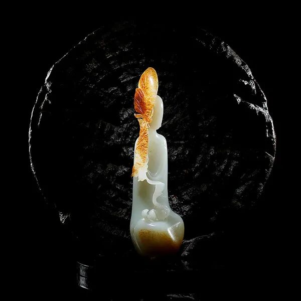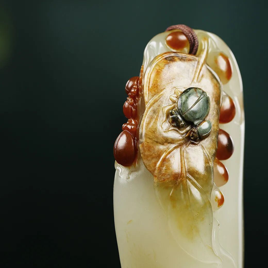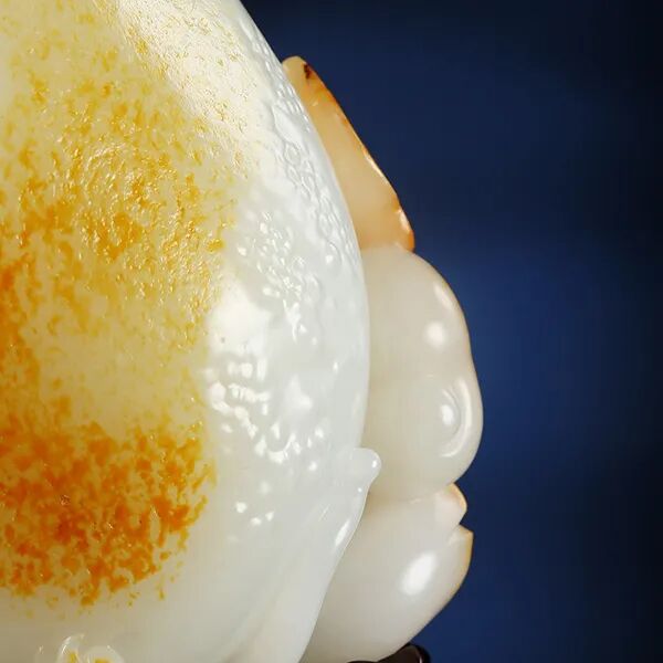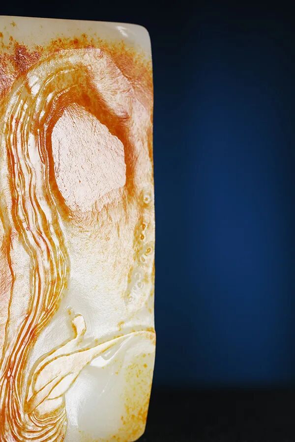 所以,很多重皮色的料子会旋转不切,只做表面皮色的一个雕刻,可以说是既保留了原石的美,也有了玉雕的发挥余地。