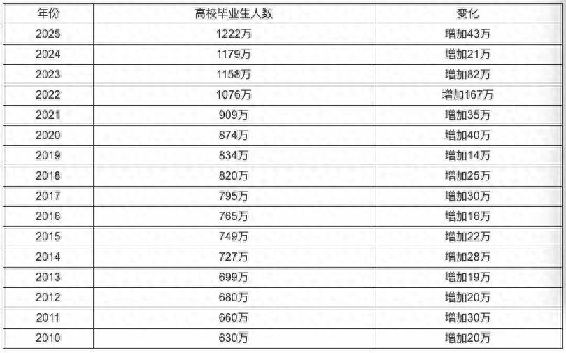 据了解,2025年全国高校毕业生人数约为1222万人,比去年增加了43万人。