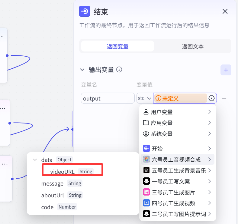 六号员工的输入有两个值,一个是五号员工生成的音乐,选bgm_url,一个是四号员工生成的视频,选video。