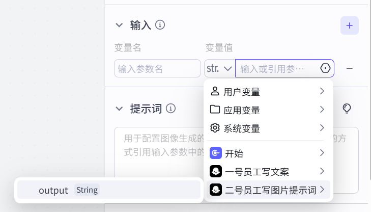 接着就是招募二号员工。同样,这个岗位的工作是与文字相关,即根据一号员工的文案提炼出图片提示词,而它的输入指令则来自一号员工的输出指令。