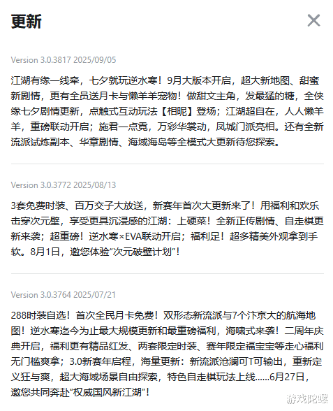 光这么说可能略显苍白——你看从7月到现在,近三个月《逆水寒手游》的地图、玩法、剧情及联动更新起来都不带停的,确保玩家上线随时有新内容可以体验。
