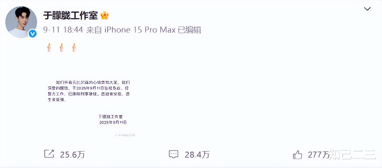 很快,这件事就得到了证实。9月11日晚上18:44分,于朦胧工作室发布声明,确认其于当日在北京朝阳区某小区坠楼身故,享年37岁。