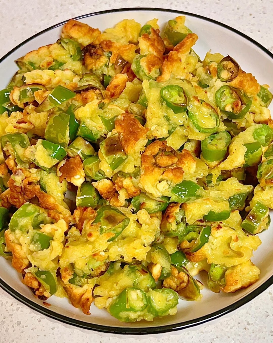 把所有材料倒进大碗,分三次加清水(约50ml),搅拌成酸奶状的浓稠面糊。关键是要让每块辣椒都裹满面糊,但又不能太稀否则挂不住。