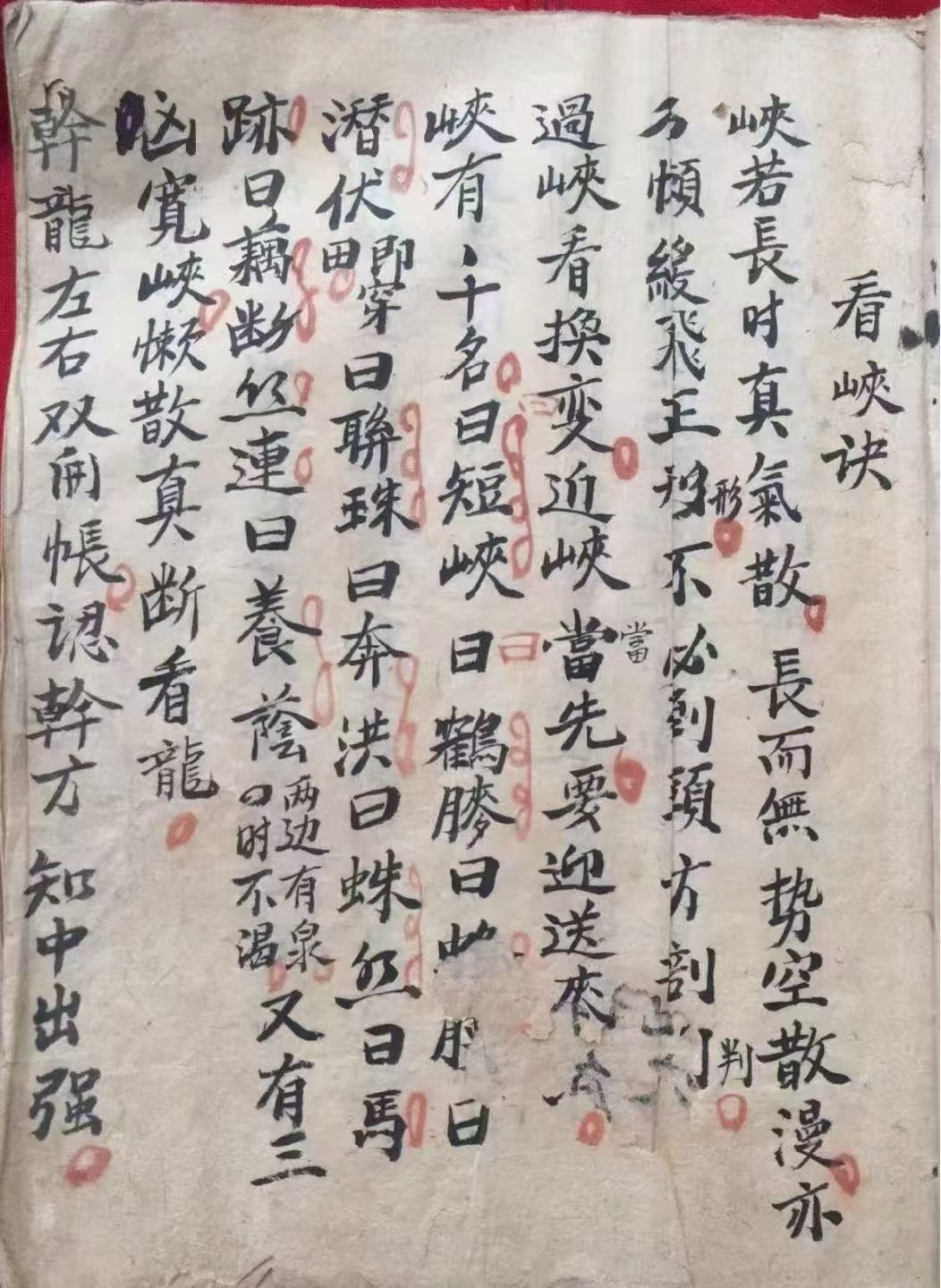 不同于传世典籍的 “泛论式” 讲解,这部抄本的核心价值在于 “聚焦实战”。开篇即打破 “龙脉难辨” 的认知误区,以 “三看三辨” 法拆解寻龙关键:看山脉 “起伏转折” 辨龙脉真伪,看 “枝脚护送” 辨气场强弱,看 “水口关拦” 辨地脉聚散,每一步都附带吴传茂实地勘察的案例标注,比如 “某山见五峰连珠,枝脚如旗幡,乃贵龙结穴之象”,让抽象理论有了具象参照。