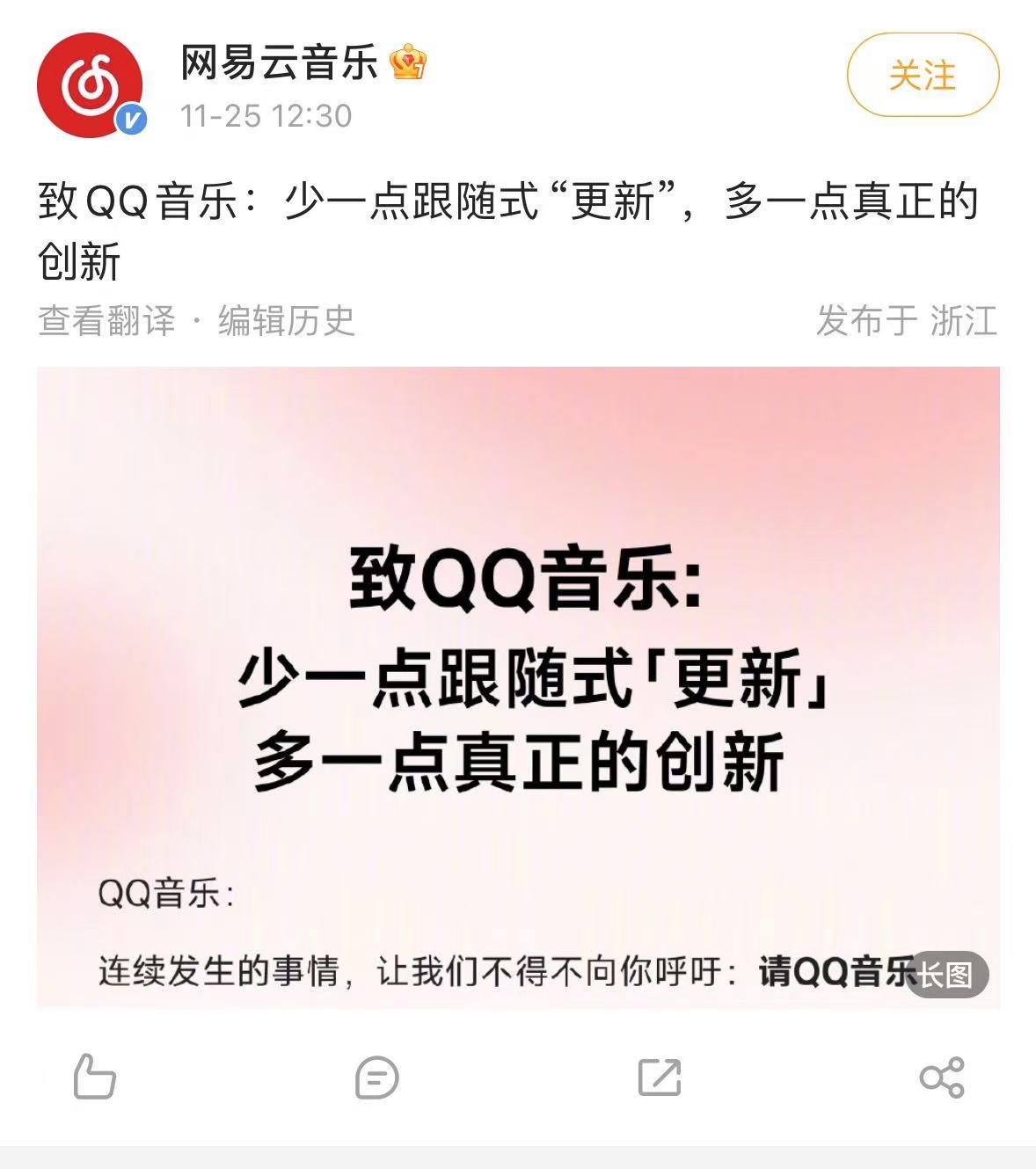 11月25日中午,网易云音乐发文喊话QQ音乐称,“少一点跟随式‘更新’,多一点真正的创新”,指出其此前上线的音乐播放器“DIY功能”被QQ音乐抄袭成“播放器自定义功能”。网易云音乐细数了两款产品之间的相似之处,并回顾了QQ音乐近年来对网易云音乐的种种“模仿”。截至发稿,QQ音乐并未回应此事,而酷狗音乐则加入了“混战”,表示自定义播放器背景的DIY功能是自己先做的。随后该事件登上微博热搜榜。