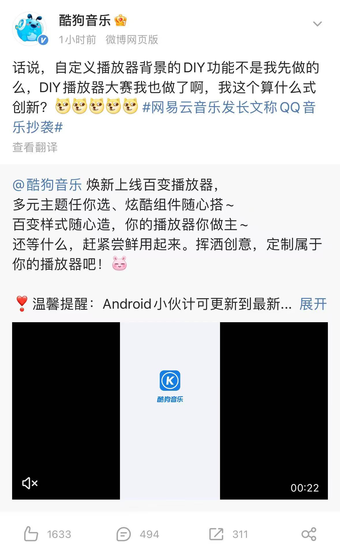 当日下午,酷狗音乐转发其去年发布的微博回击网易云音乐,“自定义播放器背景的DIY功能不是我先做的么,DIY播放器大赛我也做了啊,我这个算什么式创新?”