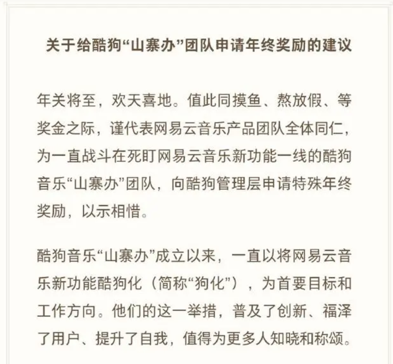 早在2021年2月,网易云音乐就曾公开发布《关于给酷狗音乐“山寨办”团队申请年终奖励的建议》,直指酷狗音乐抄袭,称其团队于2020年7月上线了“一起听”功能,一周后,酷狗上线“跟听”功能,堪称“像素级模仿”。