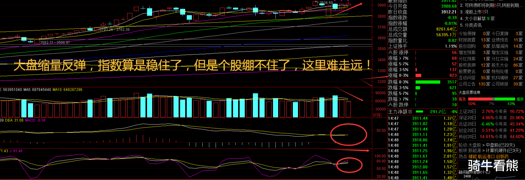 A股市场有一个特点就是“保卫战”,3600点保卫战、3700点保卫战、3800点保卫战、3900点保卫战等等,你突然会发现今年行情就是“保卫战行情”,每上100点都很艰难,这与去年924的“牛犇”行情是决然不同的。骑牛看熊认为目前已经进入到牛市后期阶段,一些个股已经提前下行跌回原点,1元股的数量开始增多,再加上一些高位股的股东开始大幅度抛售,特别是中美问题再度“升级”,现在做盘的难度会比之前难很多。现阶段还是谨慎为上,等待调整结束后的新机会,现在最大的利好是:“机构高位还没有大幅度减仓!你还可以扛一下!”