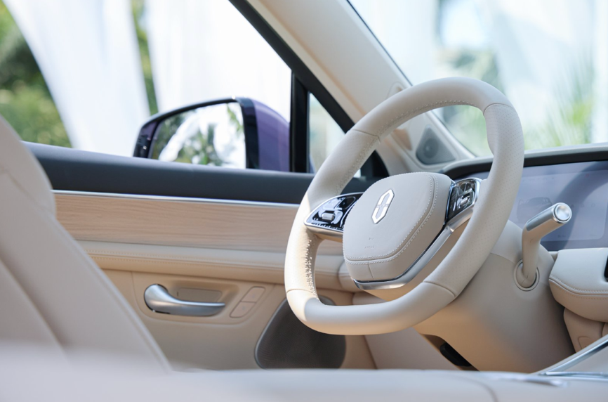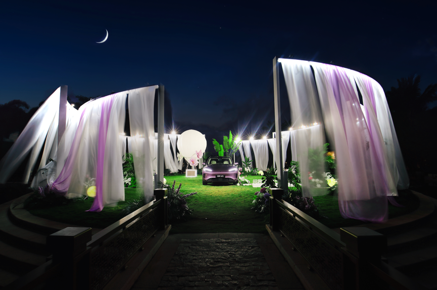 草坪主展区的幻影紫车型在绿植与光影装置中化身梦幻载体。这种源自豪车设计的色彩叙事,将科技理性与感性美学融合,又暗合“姹紫嫣红”“大红大紫”的图景寓意。幻影紫与零度白的新配色,构成了问界新M5 Ultra最具辨识度的视觉符号。色彩创新是美学的表达,更是对个性需求的洞察。于外,零度白、幻影紫新车色个性鲜明;于内,赤茶橘在营造温暖氛围的同时,彰显出精致的生活品味。