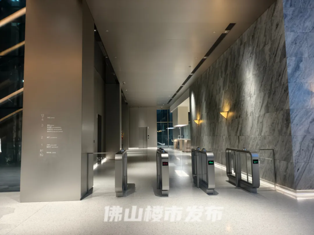一侧还设有金属智能闸机和楼层索引牌,索引显示大楼2层为展厅,3层为商业配套,4-12层为办公区。