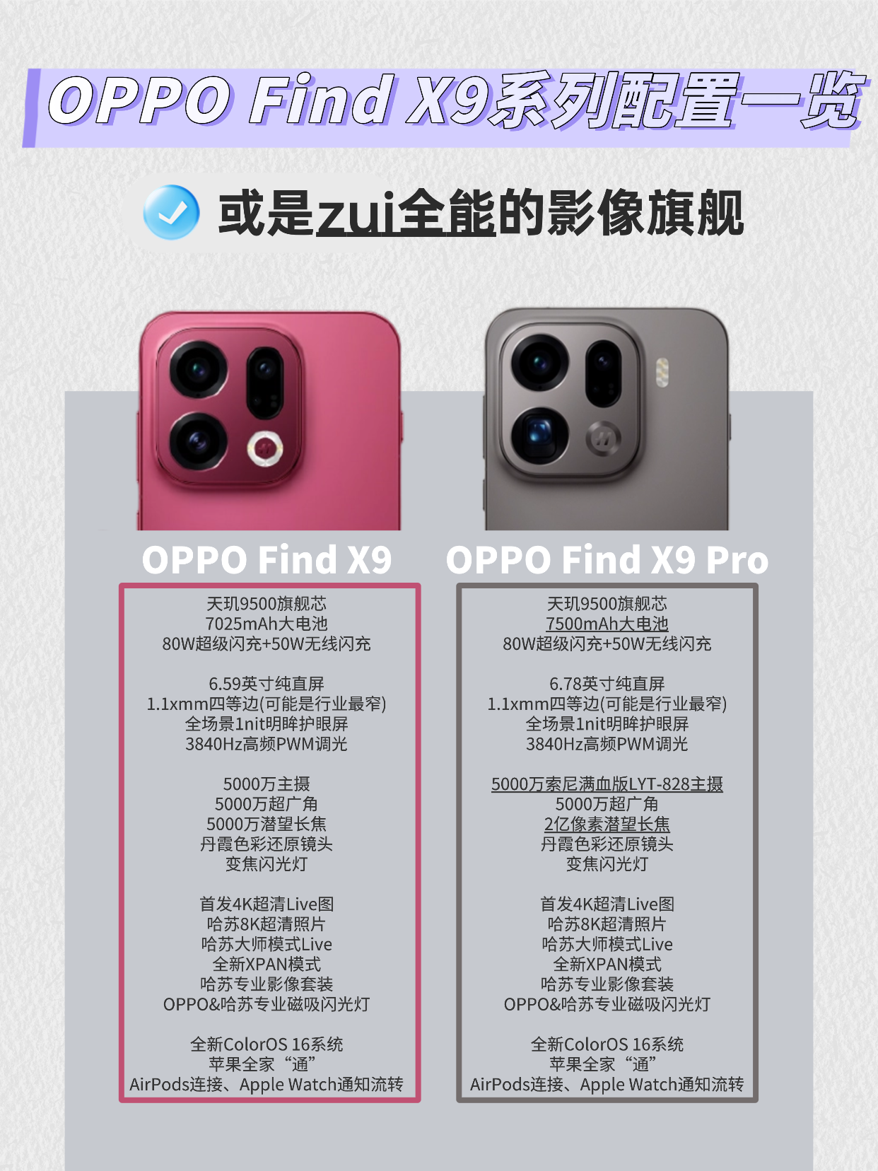 除了续航够硬,今年各家其他维度堆料都挺猛的,以其中比较突出的OPPO Find X9系列为例,影像升级给到了满血版索尼LYT-828主摄、2亿像素潜望,同时还全系标配了丹霞色彩还原镜头、变焦闪光灯,并且联合哈苏更推出了哈苏8K超清照片、哈苏大师模式Live,配套哈苏专业影像套装(标准版也有),外加行业首发4K超清Live,影像可玩性不要太丰富,再算上天玑9400旗舰芯兜底性能、全场景1nit明眸护眼屏、打通AirPods、Apple Watch设备互通,说OPPO Find X9系列是下半年zui全能的影像旗舰不为过,感兴趣的可以蹲一蹲10月16号的发布会~