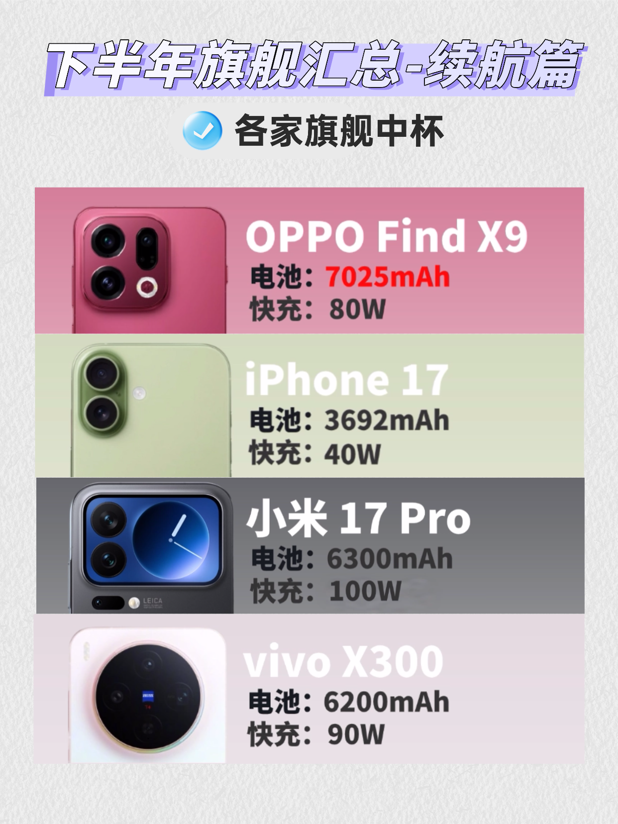 OPPO Find X9(7025mAh)>小米17 Pro(6300mAh)>vivo X300(6200mAh)>iPhone17(3692mAh)