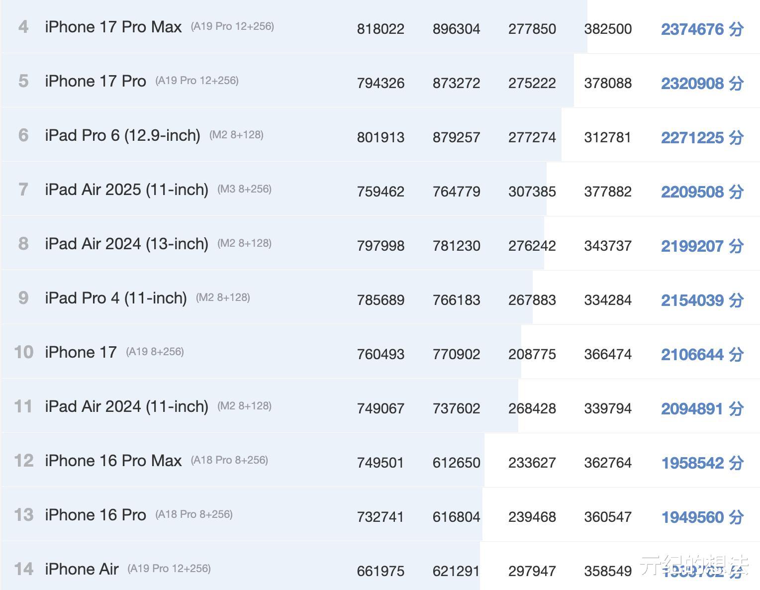 今天分享的是2025年9月份iOS设备性能榜,其中最大的看点是iPhone17系列,这也是写这篇文章的主要目的。其中iPhone Air跌出前十,iPhone17排名第十,最大的黑马是iPhone17Pro系列,以230万+的平均成绩排在第四名和第五名。