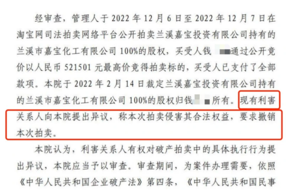 今年10月31日,兰溪市法院作出裁决,撤销了三年前的拍卖。几天后,股权重新回到了原股东名下。法院工作人员解释,当初的拍卖存在程序问题,资产实际价值与成交价相差悬殊。