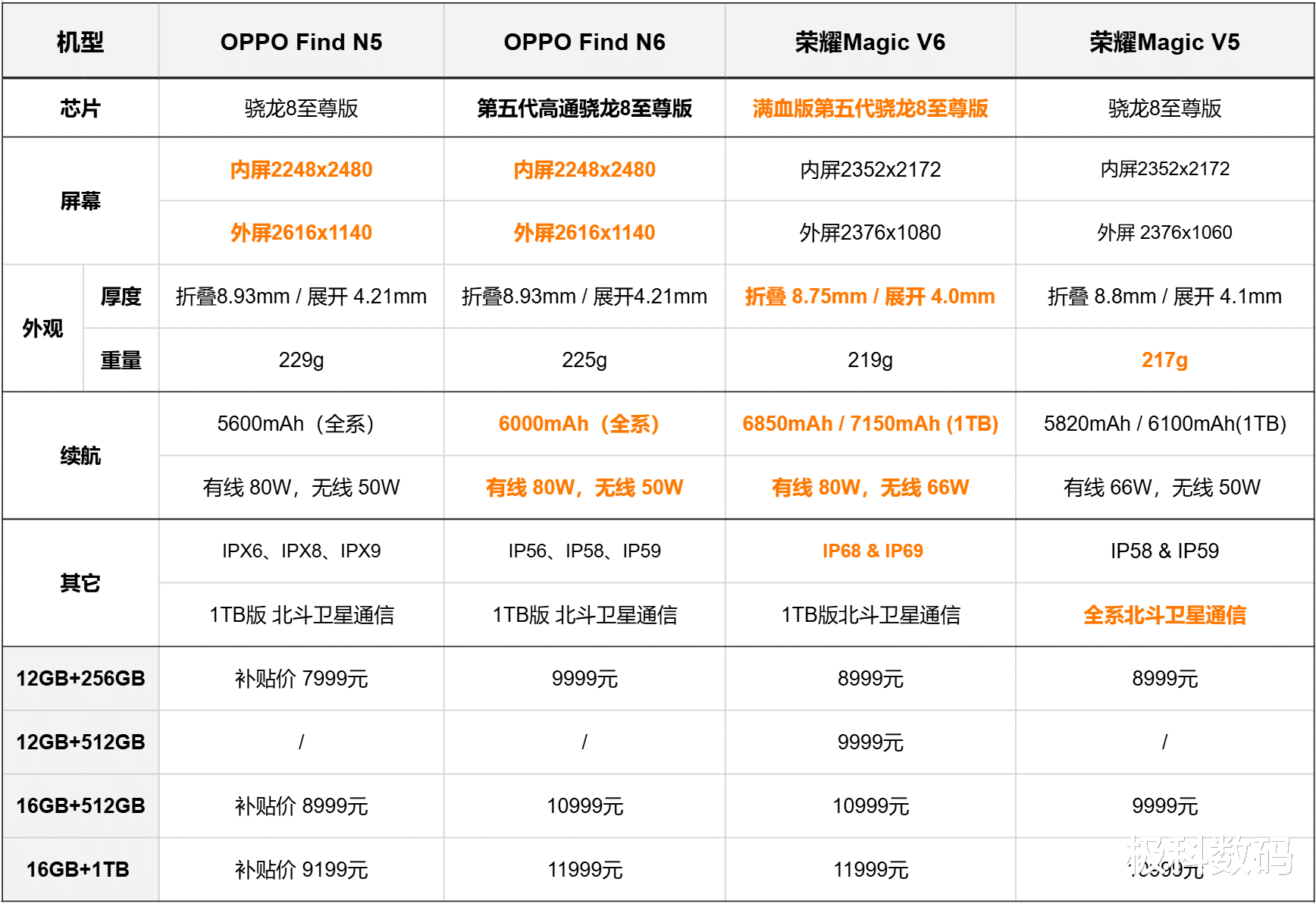 聊完Find N6,咱们把它和另外三款主流折叠屏——OPPO Find N5、荣耀Magic V6、荣耀Magic V5放在一起,看看各自的核心定位。