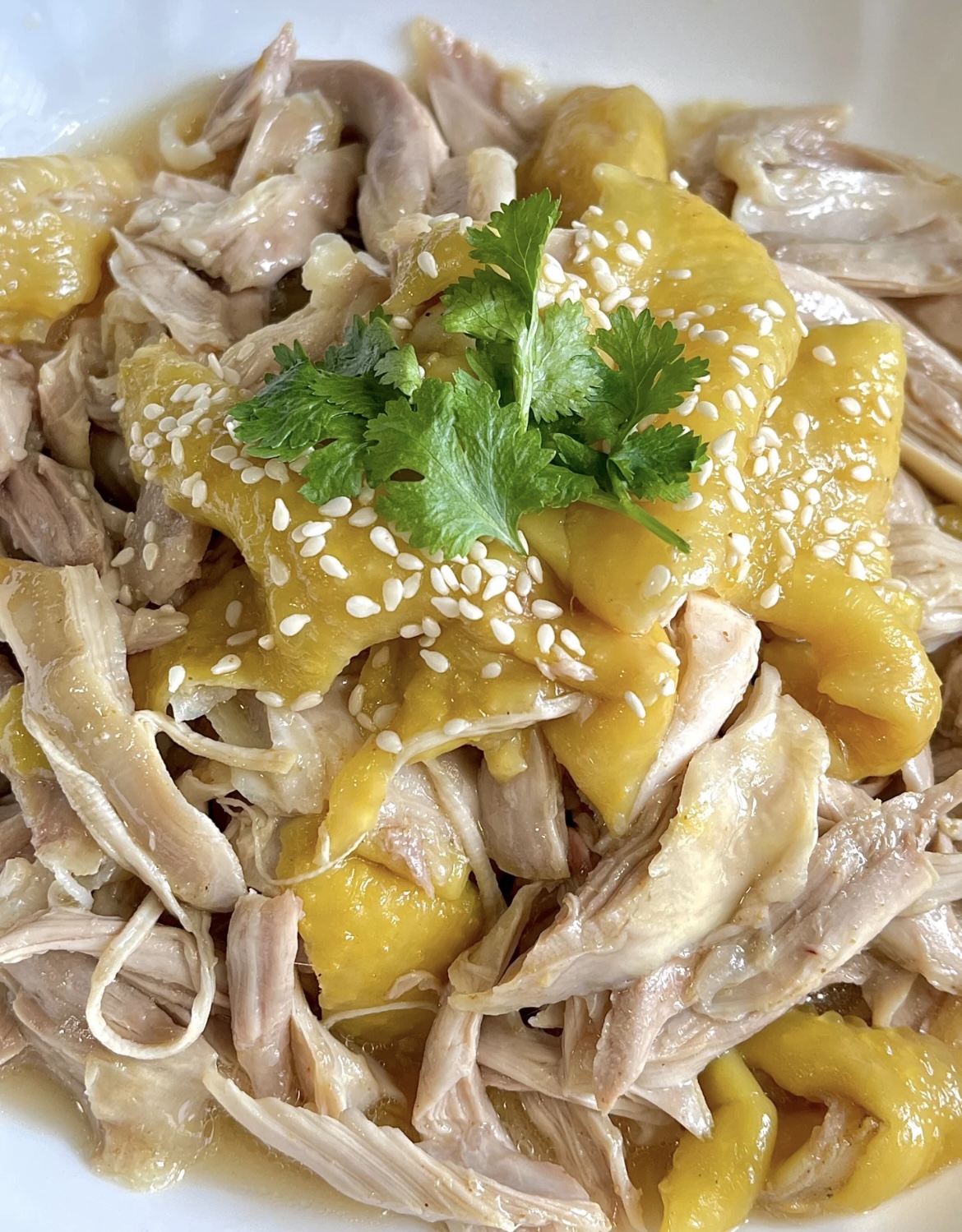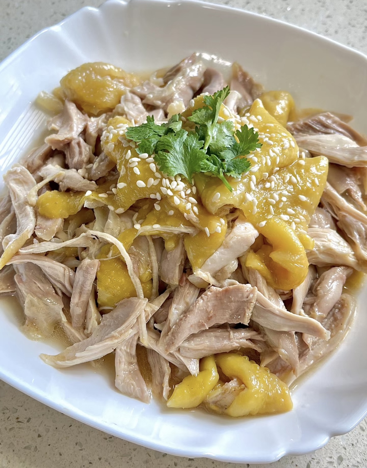 将调味后的手撕鸡腿装盘,即可上桌享用。