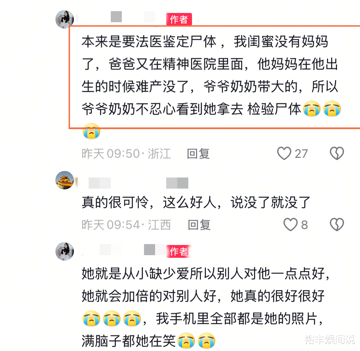 翻看留言处不难发现,陈老师去世的原因、细节以及年龄,另外还有家庭背景。据悉,陈老师是浙江某幼儿园的一位幼教,事发当天,陈老师还在上课,并在中午吃饭期间与这位闺蜜聊天,没想过是个不到三四个小时,居然接到了她的噩耗。