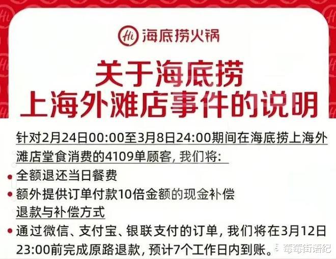 网友炸了锅,海底捞也迅速行动。他们先是报警处理,随后做出一系列补救:全面销毁涉事门店所有餐具、进行彻底消杀,并对2月24日至3月8日期间在该店消费的4109单顾客,不仅全额退款,还给予了十倍现金补偿。这一系列操作,被很多人称为“危机公关的范本”,但也有人质疑:企业为两个人的错误行为买单,合理吗?